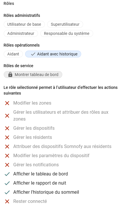 Un proche peut recevoir un rôle spécifique avec accès aux données de sommeil uniquement, sans privilèges administratifs. Cette personne peut aussi être limitée à une zone spécifique incluant uniquement une personne. Ce rôle respecte le RGPD en évitant un accès non nécessaire.