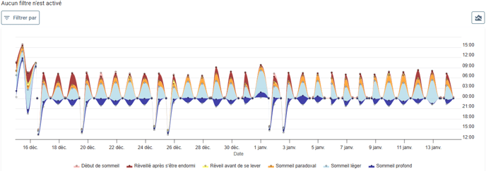 Une manière d’observer uniquement le sommeil nocturne consiste à activer le filtre Heure de début de session.